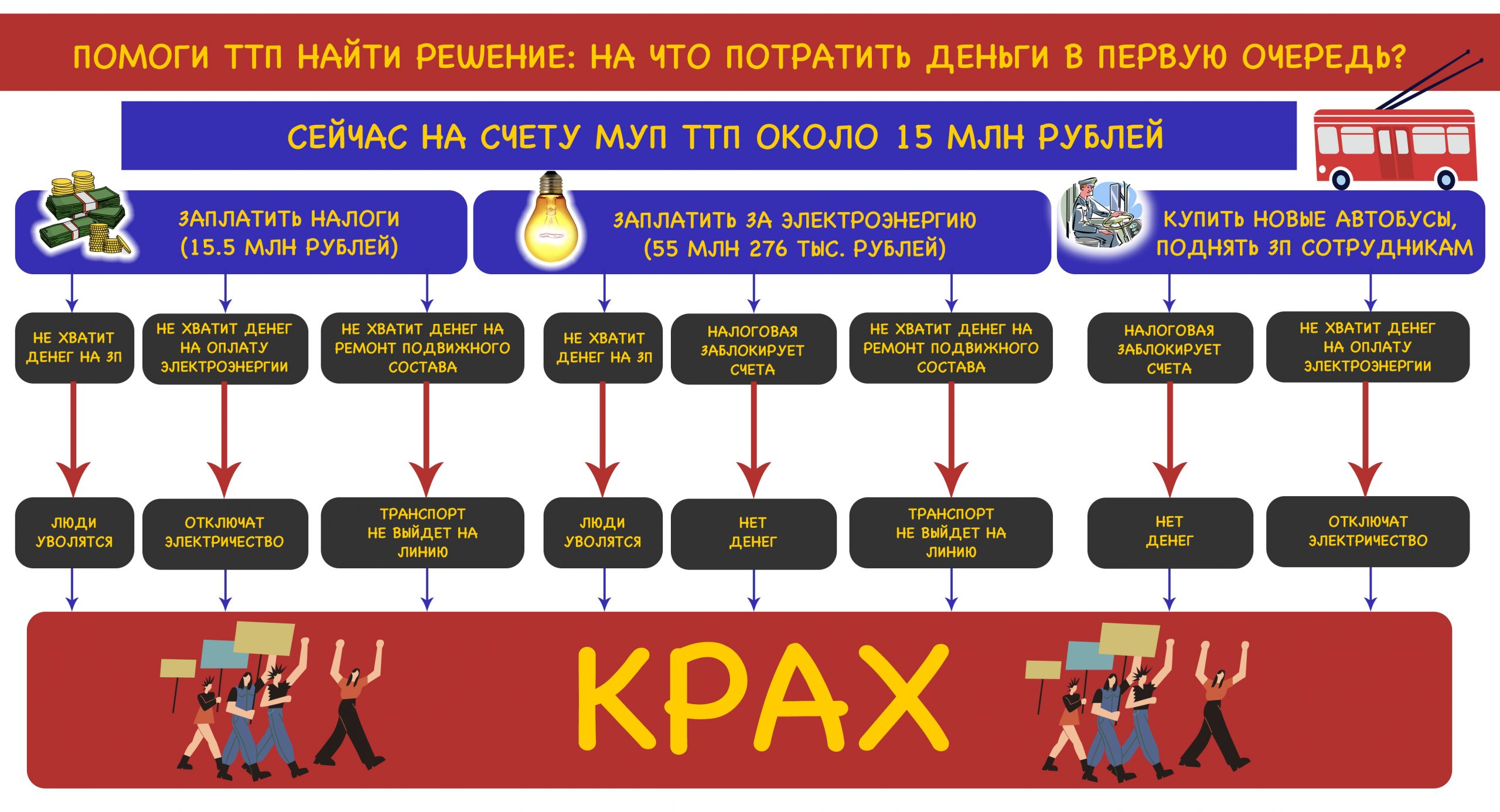 Новоиспечённый директор МУП «ТТП» Юрий Гордюшин признался в безысходности. Денег не хватает ни на что. На данный момент со всеми плюсами и минусами по сбору средств с пассажиров и прочим заработком в чистом остатке у МУП «ТТП» остаётся 15 млн рублей. Из них: налоги заплатить нужно, за электричество, которое основополагающий фактор существования предприятия – нужно, надо найти деньги на зарплату. Мы свели всё в единую схему и предлагаем нашим читателям поиграть в игру «Я – директор МУП ТТП»