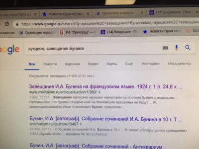 В своё время за наследством первого русского писателя – Нобелевского лауреата Ивана Бунина охотилось КГБ. Однако в конце 60-х годов прошлого столетия ЦК КПСС не захотел приобретать бунинские реликвии. И архив оказался в Великобритании, сначала – в Эдинбургском университете, а затем в Лидском. А на днях орловский музей И.А. Бунина получил странный запрос от адвокатского бюро «Падва и партнеры». Столичные адвокаты прочитали интервью пятилетней давности с директором музея Инной Костомаровой, в котором она упомянула об аукционе, где продавали никем не виданную вещь – завещание писателя на французском языке. В нём он недвусмысленно завещает своей жене «всю… материальную и интеллектуальную собственность, без исключения и оговорок…». Столичные адвокаты спрашивают, а что ещё известно в Орле об аукционе, завещании и о покупателе?