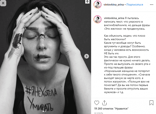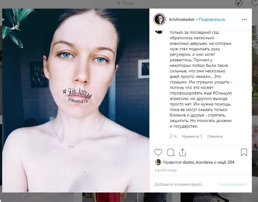 Между тем, в Сети набирает обороты флешмоб в поддержку закона о домашнем насилии, запущенный активисткой Аленой Поповой и блогером Александрой Митрошиной. Известные в мире интернета люди даже создали хештэг #ЯНеХотелаУмирать