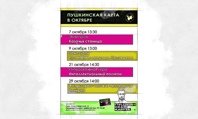 Орловский областной центр народного творчества опубликовал афишу на октябрь. В планах – четыре необычных мероприятия. Посетить их могут как взрослые, так и дети. Выгоднее всего – студентам. ...