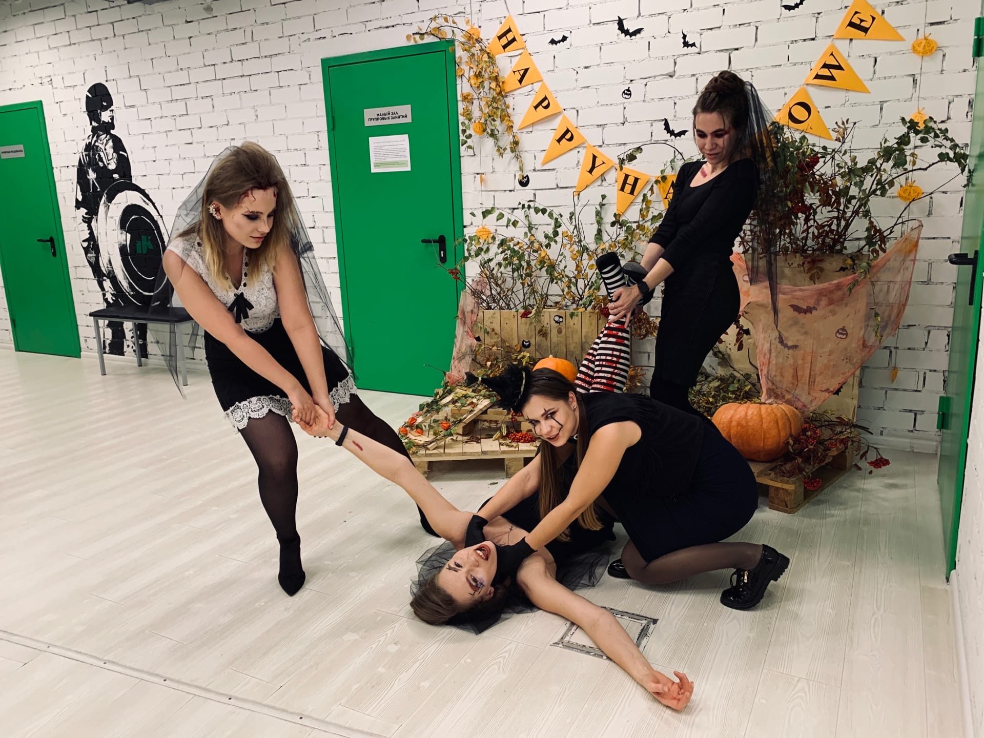Любители здорового образа жизни тоже по своему отпраздновали Хэллоуин. Помещение одного из крупных спортзалов украсили тыквами, паутиной и призраками. А тренеры перевоплотились в ведьм, колдунов и вампиров.