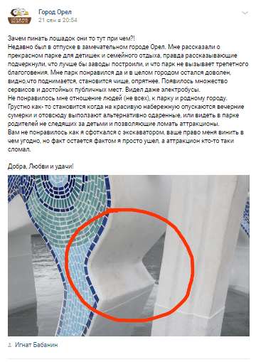 Позже в то же сообщество товарищ, видимо, желая отвести внимание от своей персоны, написал пост, в котором посетовал на жителей, которые портят имущество парка. Вон, кто-то испачкал фигуру белой лошадки у фонтана. Мол, сами жители не лучше меня будут. Почему достаётся только мне?